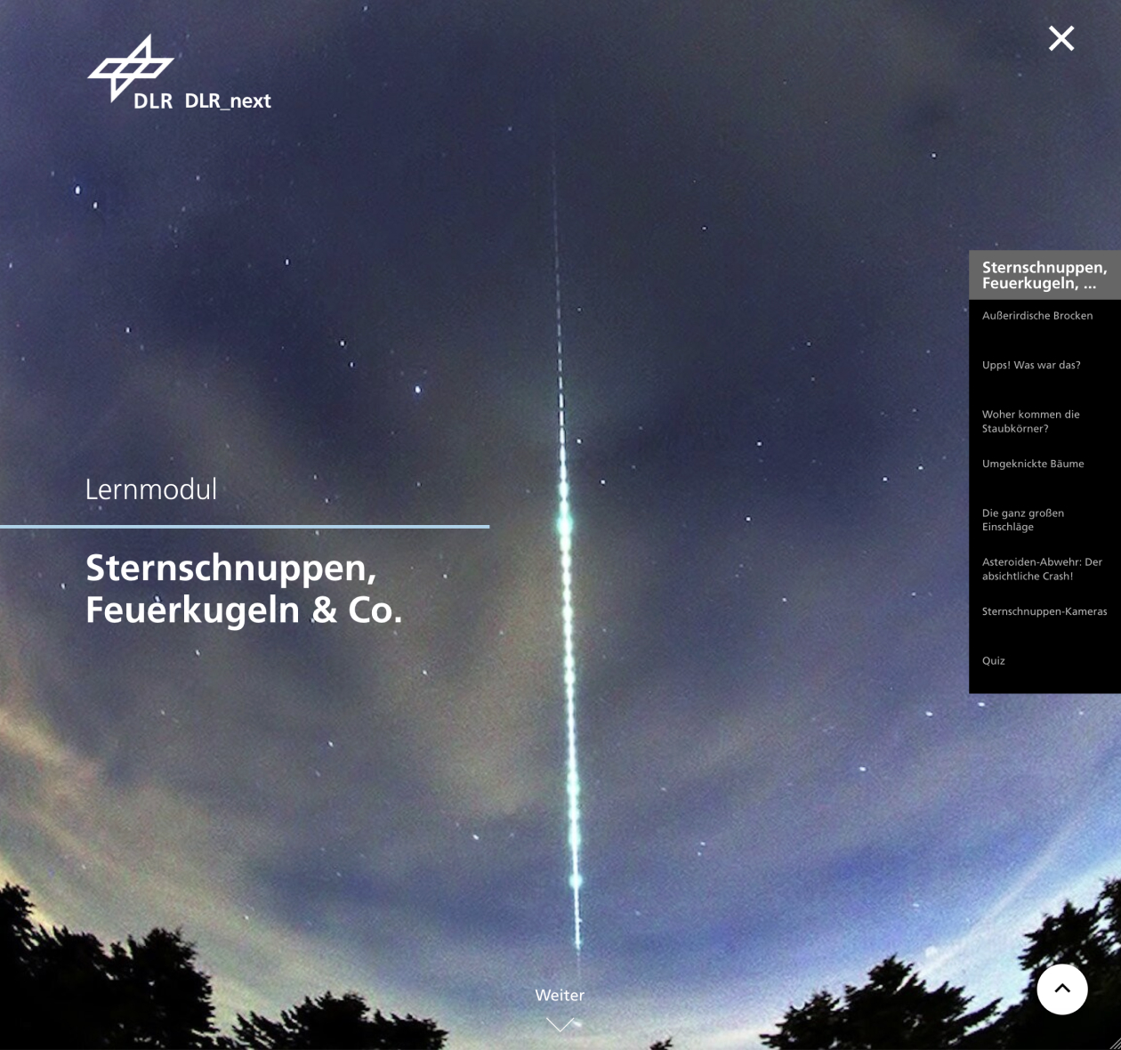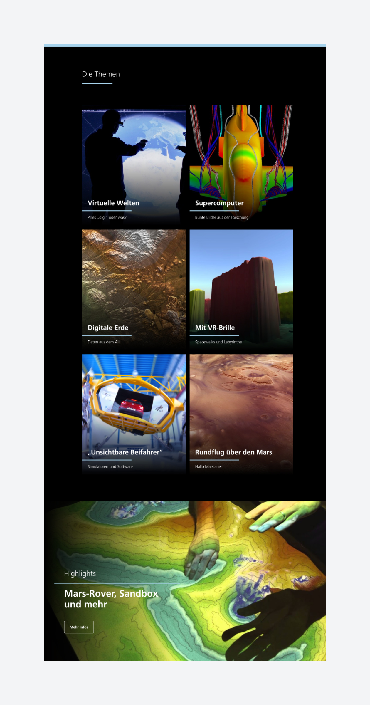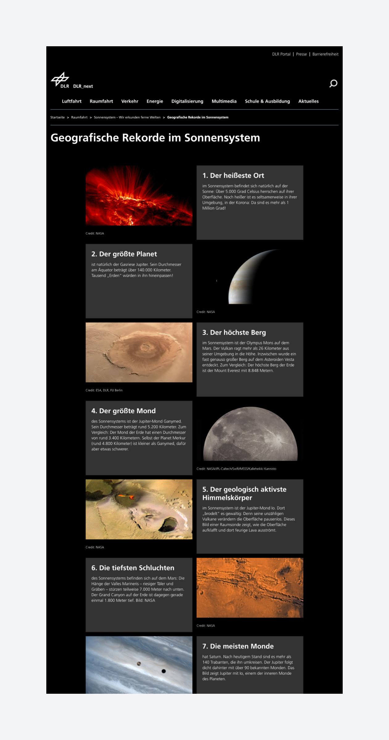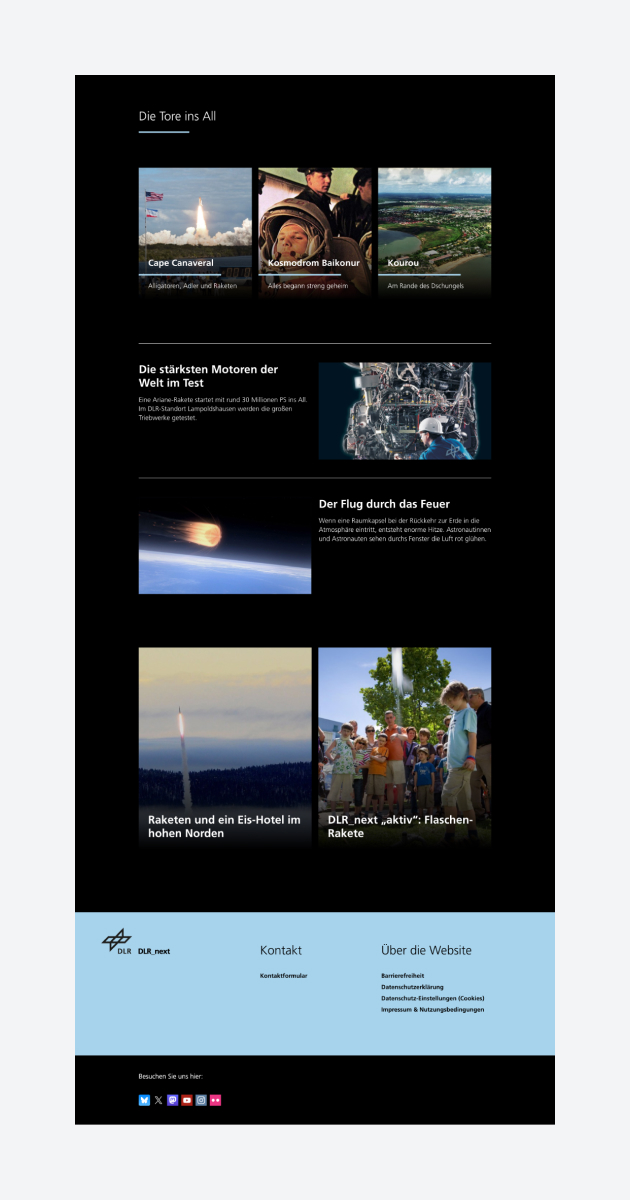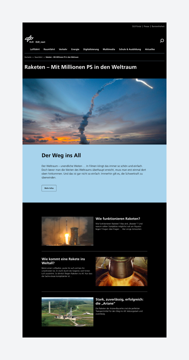 Die bestehende DLR_next Website war inhaltlich reich, aber technisch und visuell in die Jahre gekommen. Mobile Nutzerfreundlichkeit, Barrierefreiheit und zeitgemäße Interaktionsmöglichkeiten waren nur eingeschränkt gegeben. Zudem sollten neue Inhalte wie Videos, interaktive Features und Unterrichtsmaterialien einfacher auffindbar und besser inszeniert werden.