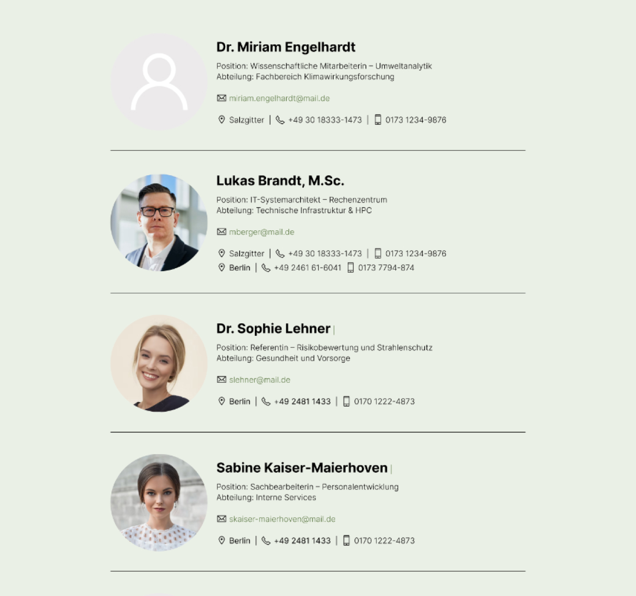 Personenverzeichnis: Automatisierte Synchronisierung von Personendaten aus LDAP/AD und einer externen Mitarbeiterdatenbank. Auflistungen von Personen für Organisationseinheiten oder Fachbereiche oder für Kontaktinformationen. Einbindung der Personen in die Autocomplete-Suche und in die facettierte Suche.