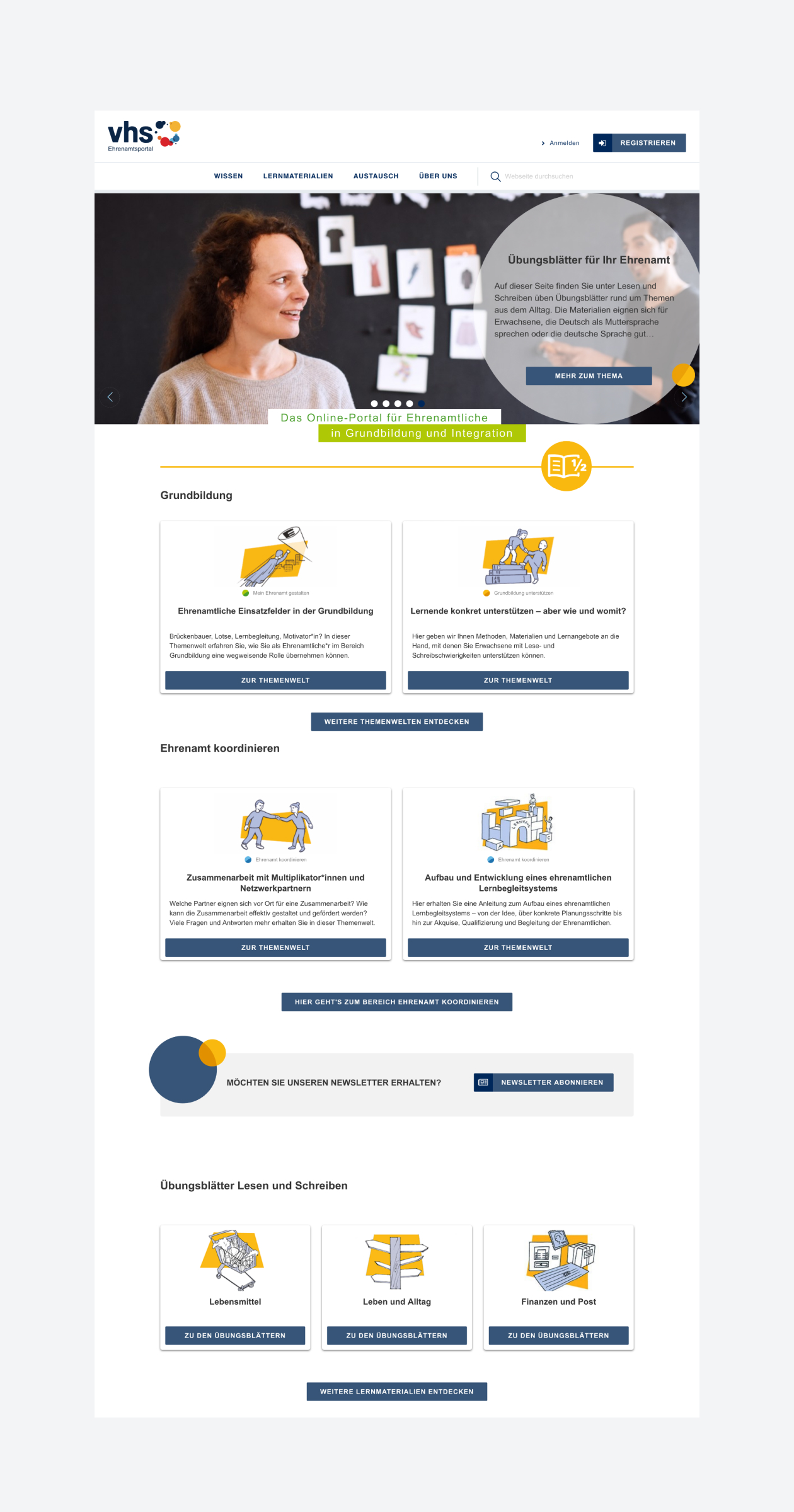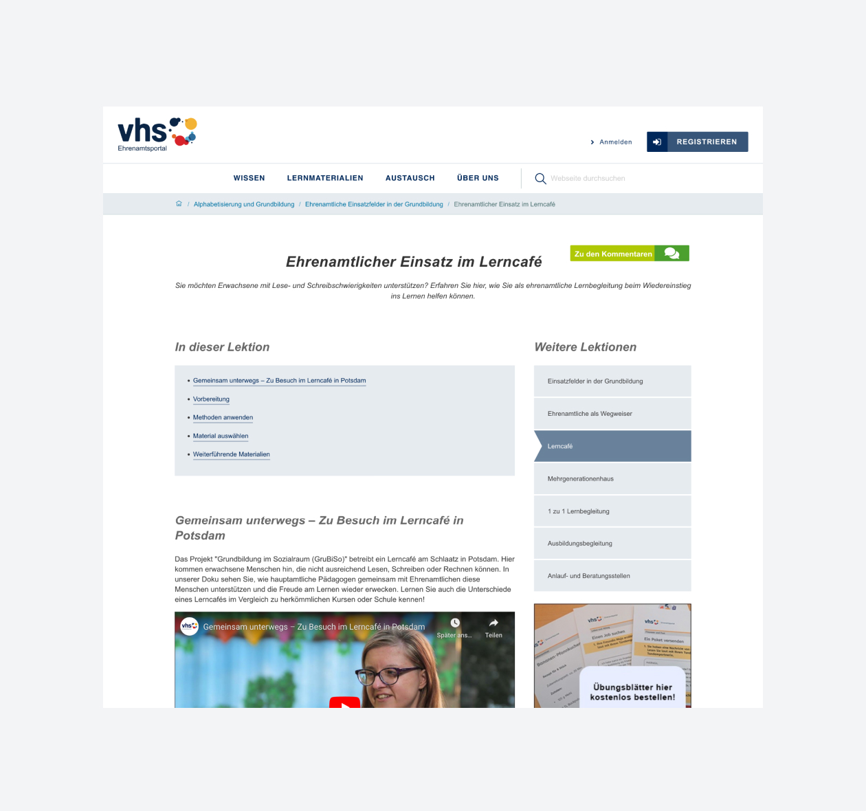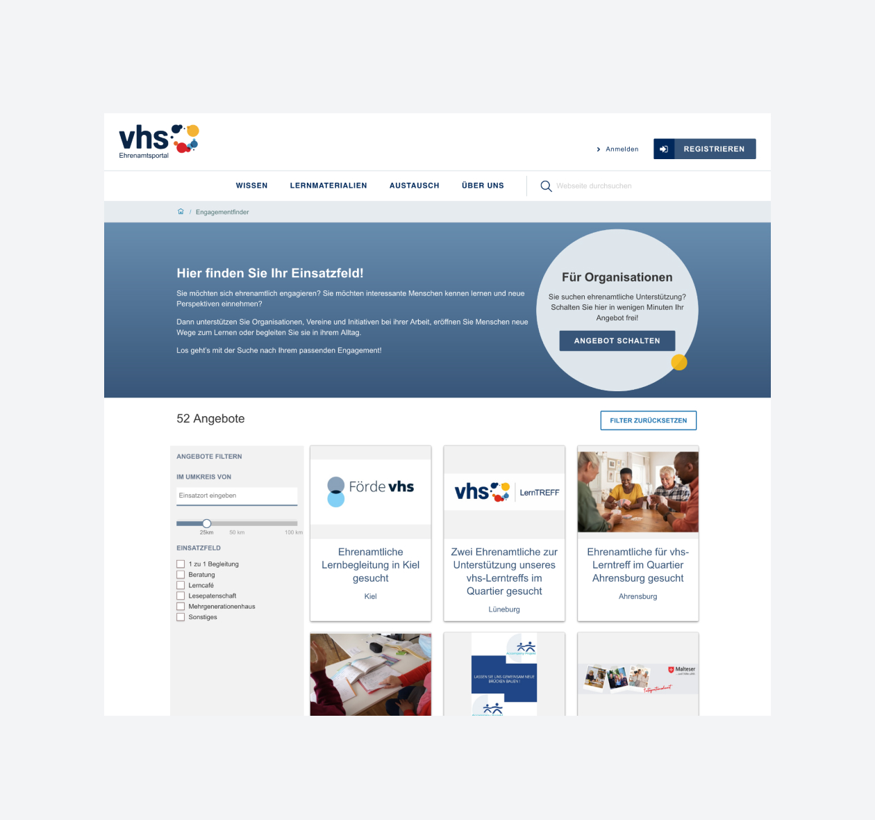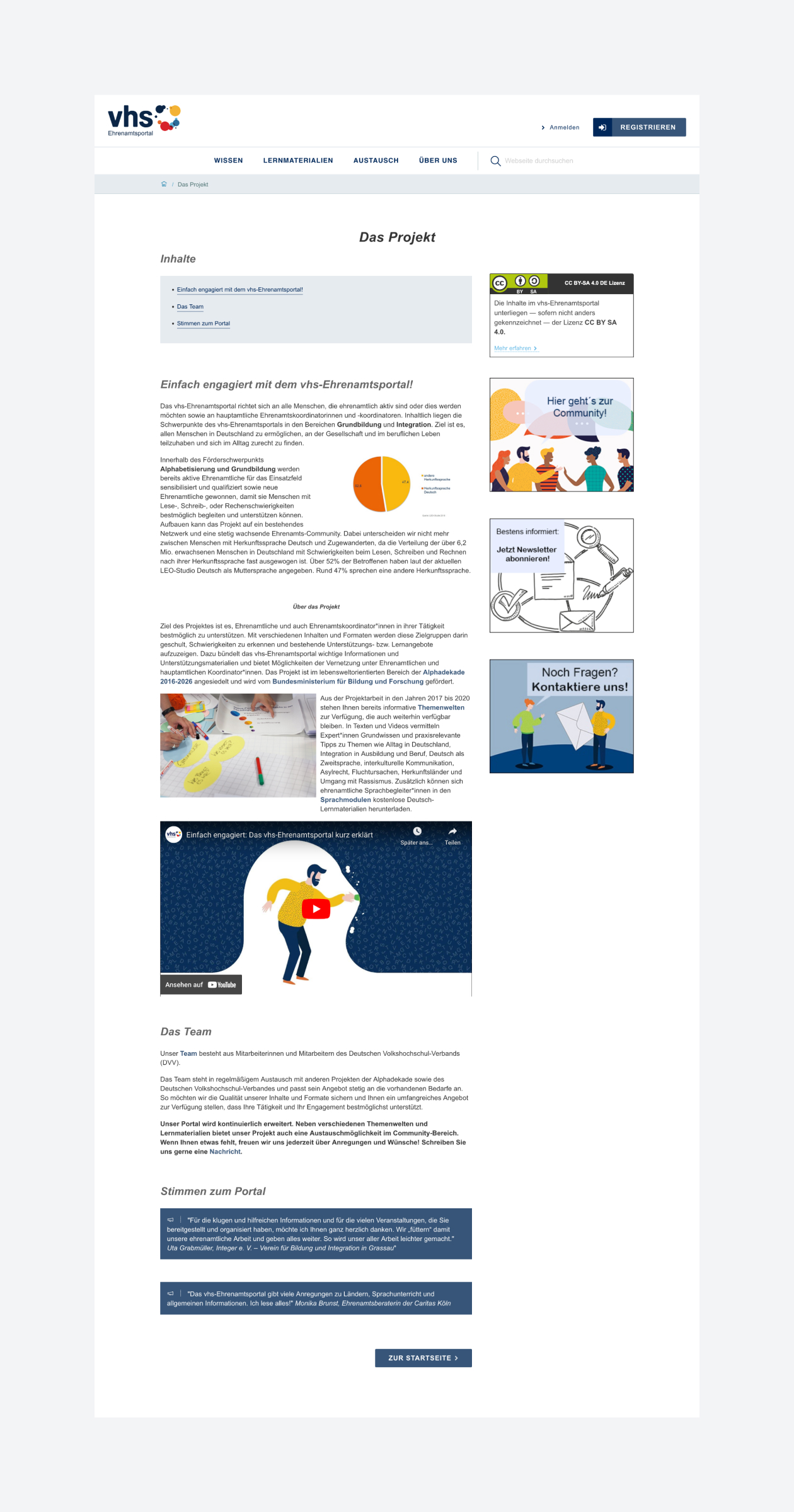 Das VHS-Ehrenamtsportal wurde 2018 offiziell vorgestellt und kontinuierlich weiterentwickelt. Die erfolgreiche Umsetzung führte dazu, dass der DVV bereits 2019 ein Folgeprojekt beauftragte, um die Plattform weiter auszubauen.