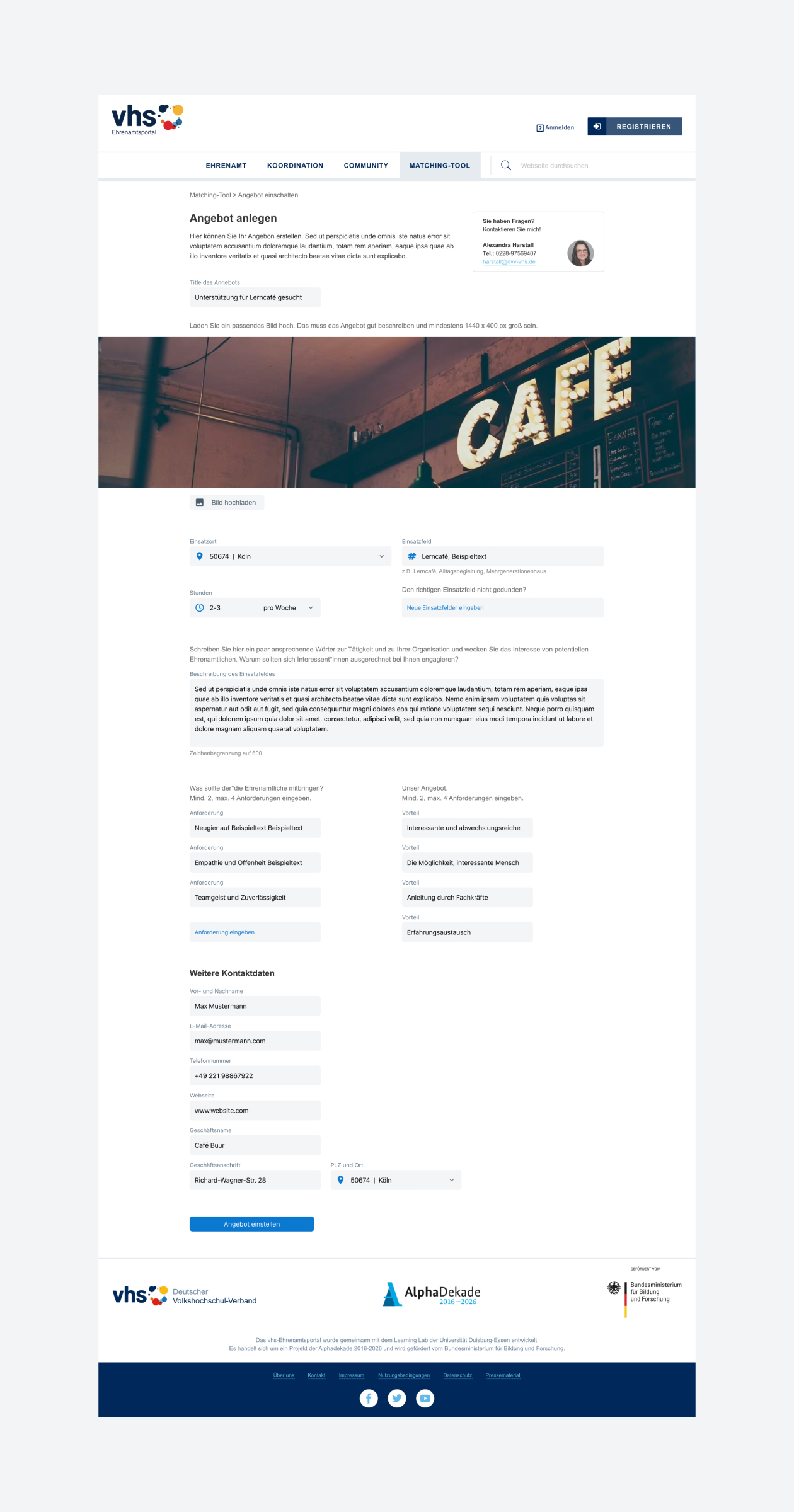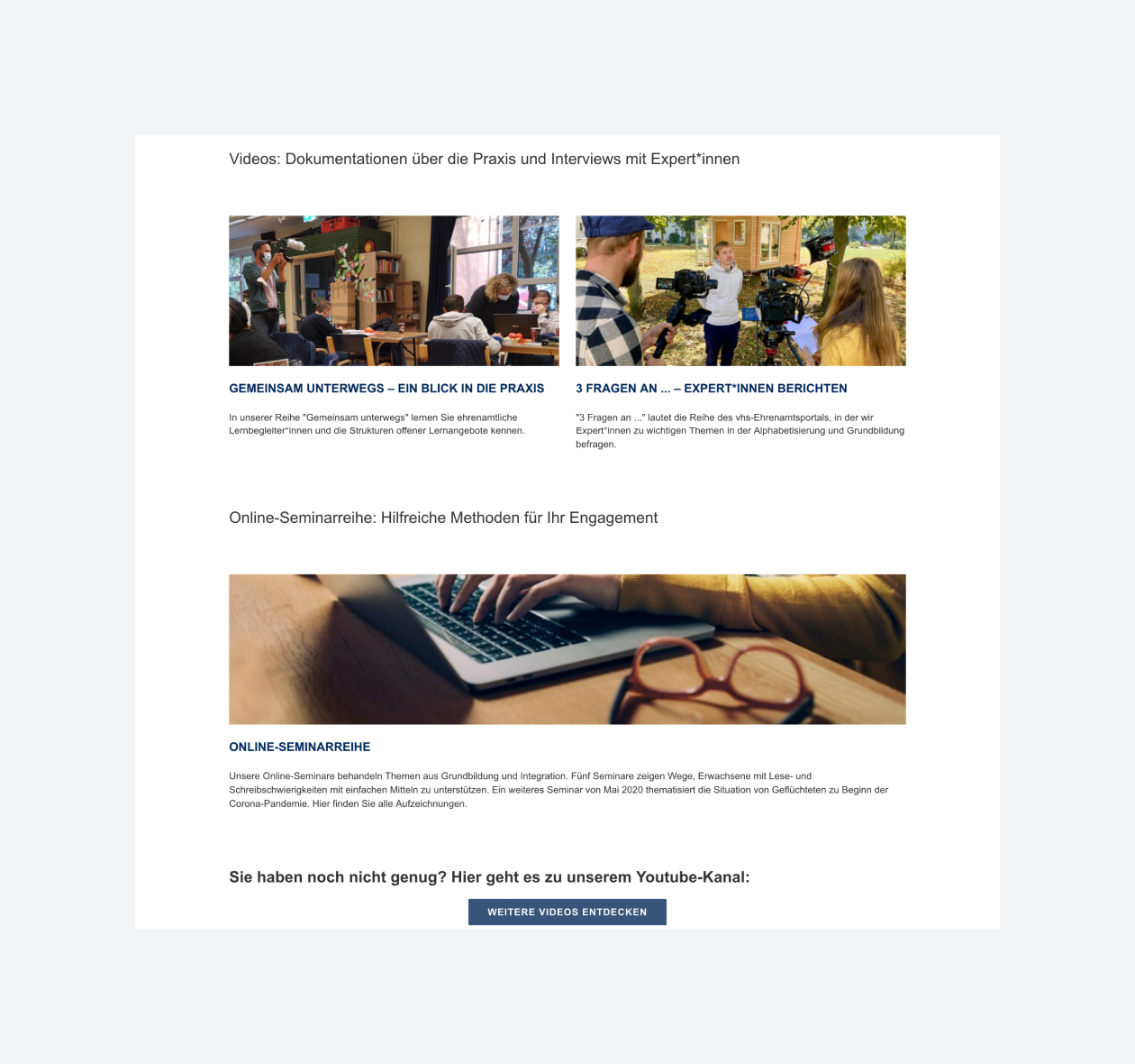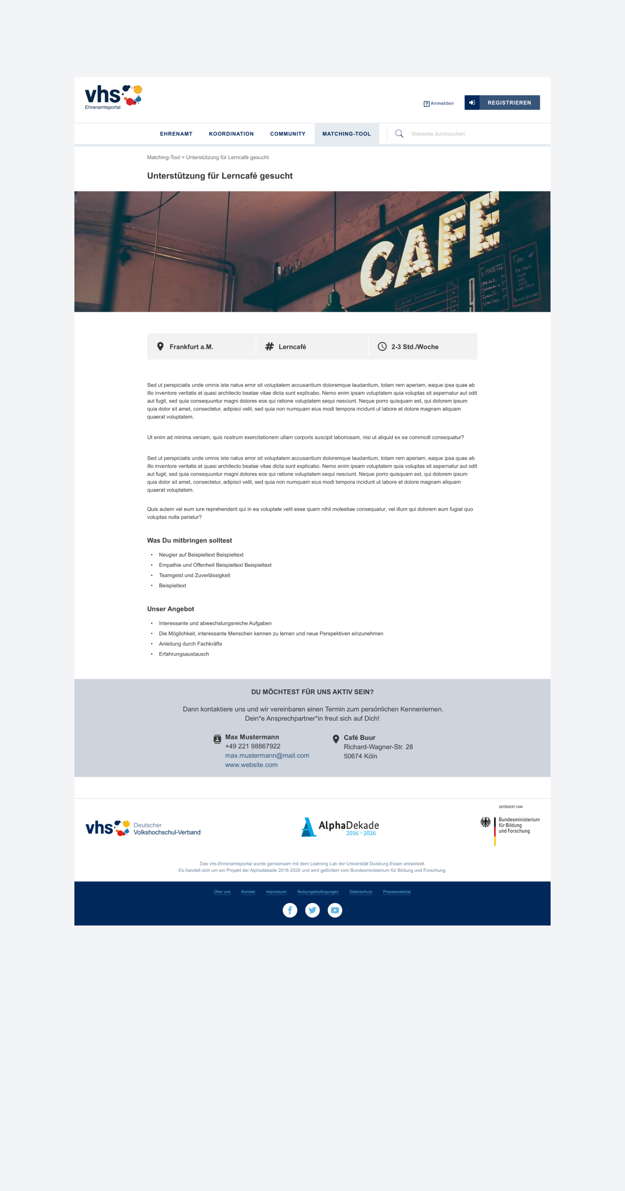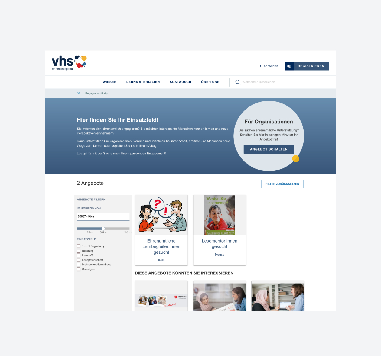 Das VHS-Ehrenamtsportal wurde 2018 offiziell vorgestellt und kontinuierlich weiterentwickelt. Die erfolgreiche Umsetzung führte dazu, dass der DVV bereits 2019 ein Folgeprojekt beauftragte, um die Plattform weiter auszubauen.