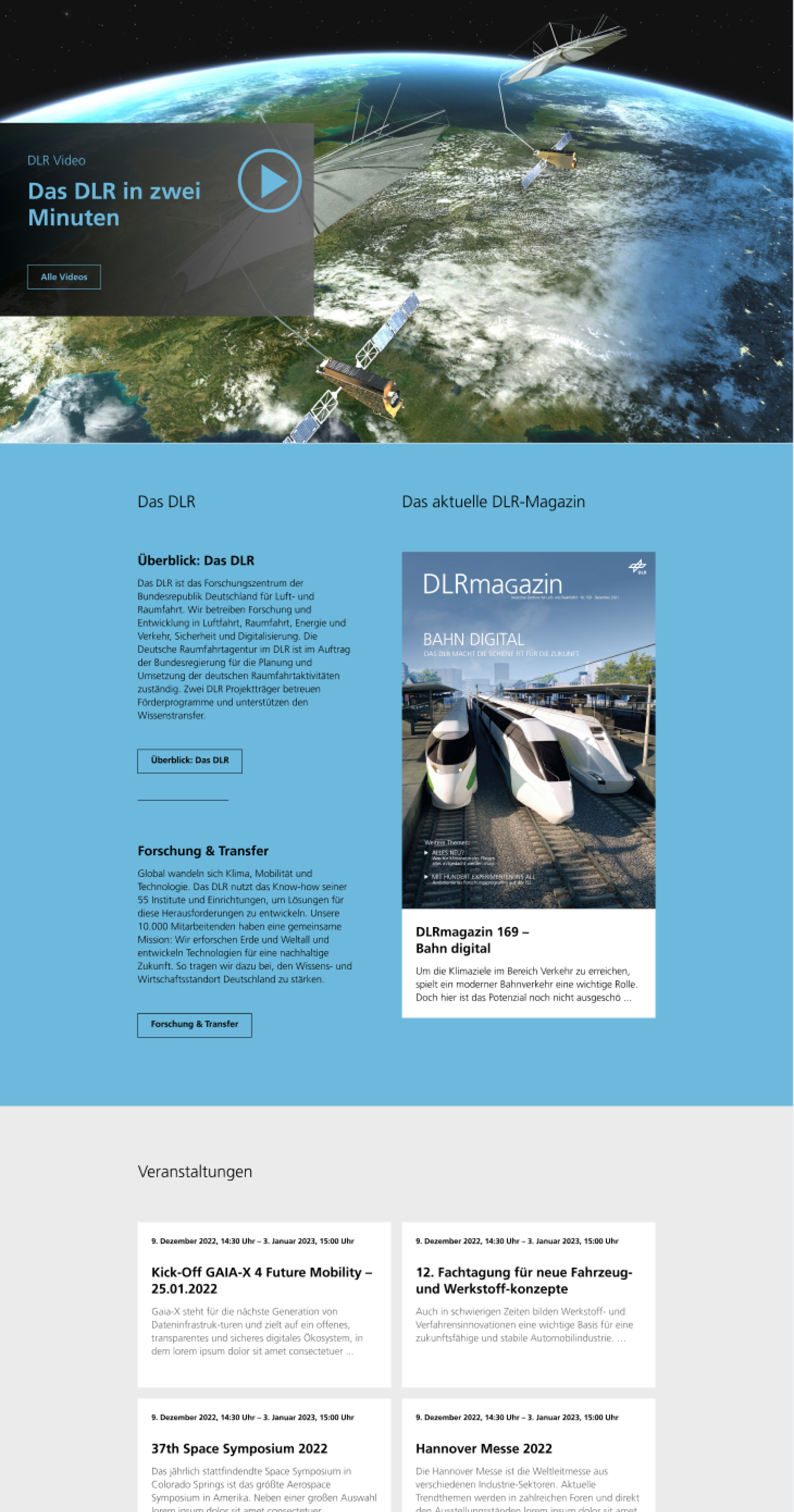 Innerhalb von 5 ½ Monaten wurde für das DLR Hauptportal ein komplett neues, visuell stark vereinfachtes und klares Design entworfen auf Basis einer neuen und konsistenten Informationsarchitektur und Ausrichtung. Das neue Redaktionssystem wurde mit Plone 6 umgesetzt und Redakteure und Redakteurinnen mit dem neuen benutzerfreundlichen System geschult. Darüber hinaus wurden die Basisinhalte aus dem alten CMS automatisiert migriert.