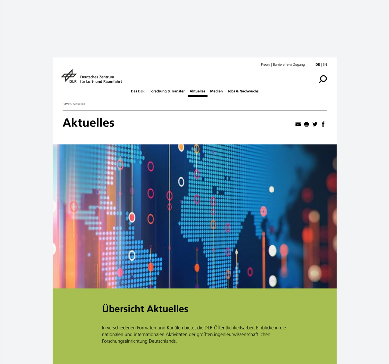 Das Deutsche Zentrum für Luft- und Raumfahrt (DLR) stand vor der Herausforderung, seine Webseite zu modernisieren, um den stetig wachsenden Anforderungen seiner Nutzer gerecht zu werden. Die bestehende Webseite entsprach nicht mehr den aktuellen Standards und konnte die Vielfalt der Inhalte sowie die Bedürfnisse der unterschiedlichen Zielgruppen nicht optimal abbilden.