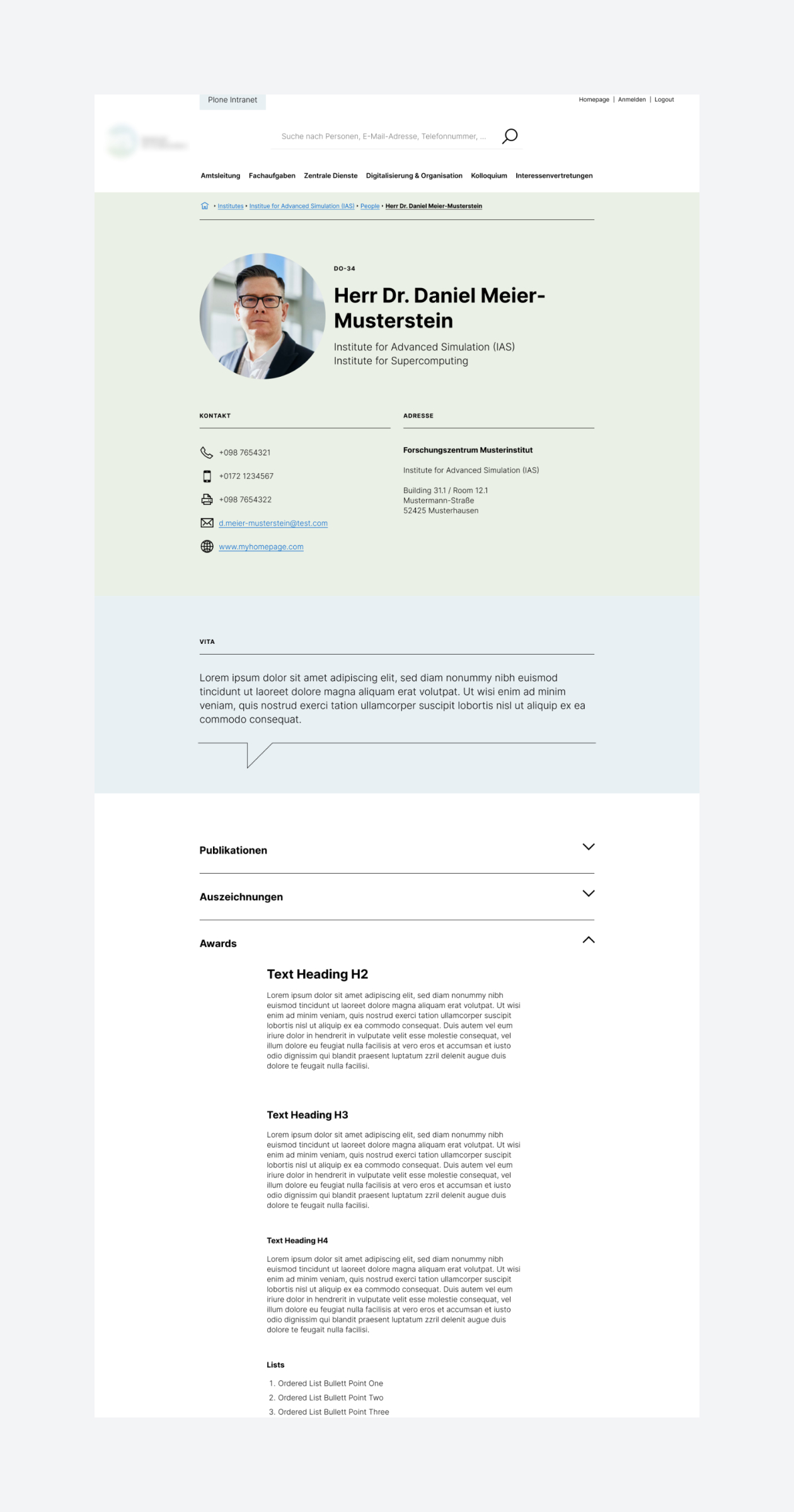 Personenverzeichnis: Automatisierte Synchronisierung von Personendaten aus LDAP/AD und einer externen Mitarbeiterdatenbank. Auflistungen von Personen für Organisationseinheiten oder Fachbereiche oder für Kontaktinformationen. Einbindung der Personen in die Autocomplete-Suche und in die facettierte Suche.