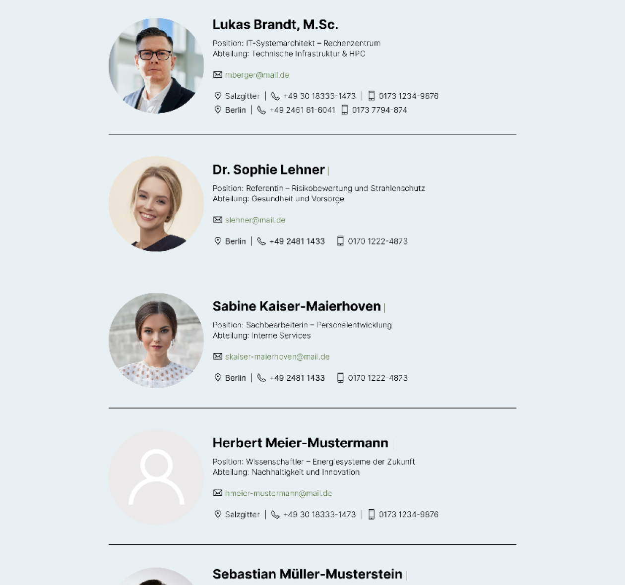 LDAP/AD-Anbindung: Die LDAP/AD-Anbindung sorgt dafür, dass Personendaten automatisch aktuell sind. Mitarbeitende können sich über erweiterte Personenprofile mit Foto, Kontaktdaten und Kompetenzen präsentieren.